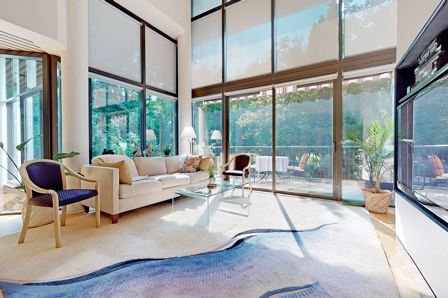 Enter the property on the circular driveway. Be dazzled by the architecture and design. You’ll notice that the house is perched proudly high above the professionally landscaped grounds and that each floor steps back to take advantage of the natural sunlight. The graceful horizontal lines flow both horizontally and vertically. The building is imposing and elegant at the same time. Walk into the front entry, over the black granite clad interior ‘bridge’, and stand in awe with views over the soaring interior atrium. Four massive light shafts above flood the space in natural sunlight year-round.