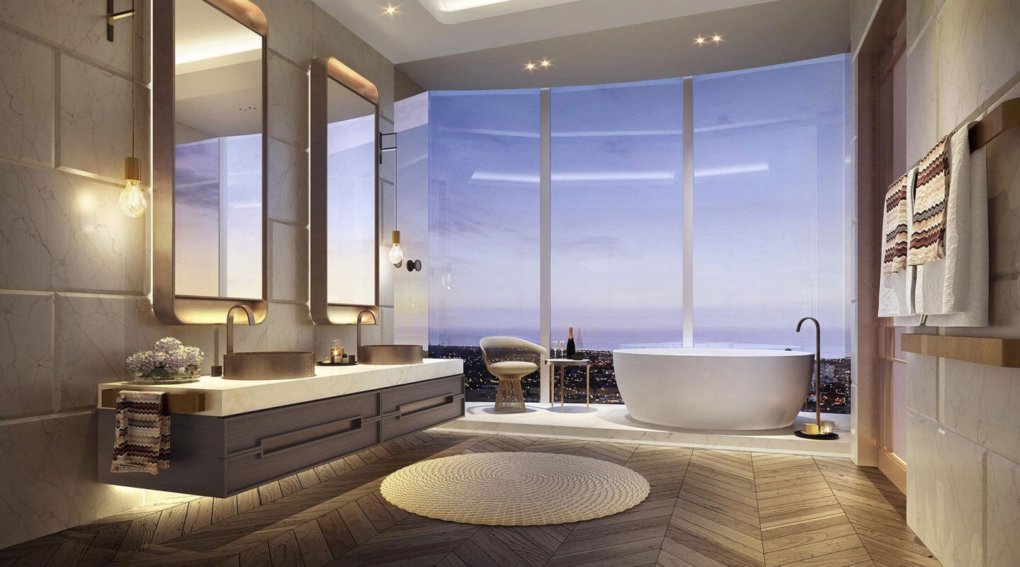 A glamorous ambience and aura of tranquility merge to create a world away from the busy streets below. In harmony with the stunning views, a palette of contemporary finishes, plush carpet, and soft indirect lighting, make for a relaxed bedroom setting. A spacious interior and dressing area with thoughtfully designed storage provide a sense of order and calm. Dream the night away in a private peaceful haven.
